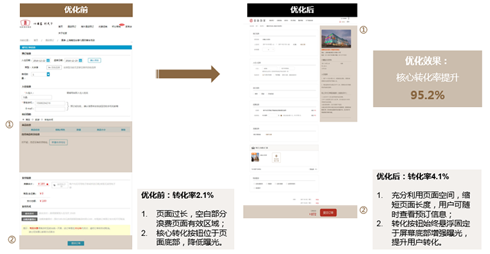 转化流程——充分利用页面空间,缩短页面长度,减少由于页面过长、空白部分浪费页面有效区域的情况,用户可随时查看预订信息;将原来位于页面底部曝光量低的核心转化按钮,改为转化按钮始终悬浮固定于屏幕底部增强曝光,提升用户转化;全流程、各层级优化,保障官网转化效果。